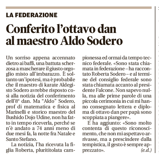 Messaggero Veneto, lunedì 26 febbraio 2018: Conferito l'ottavo dan al maestro Aldo Sodero