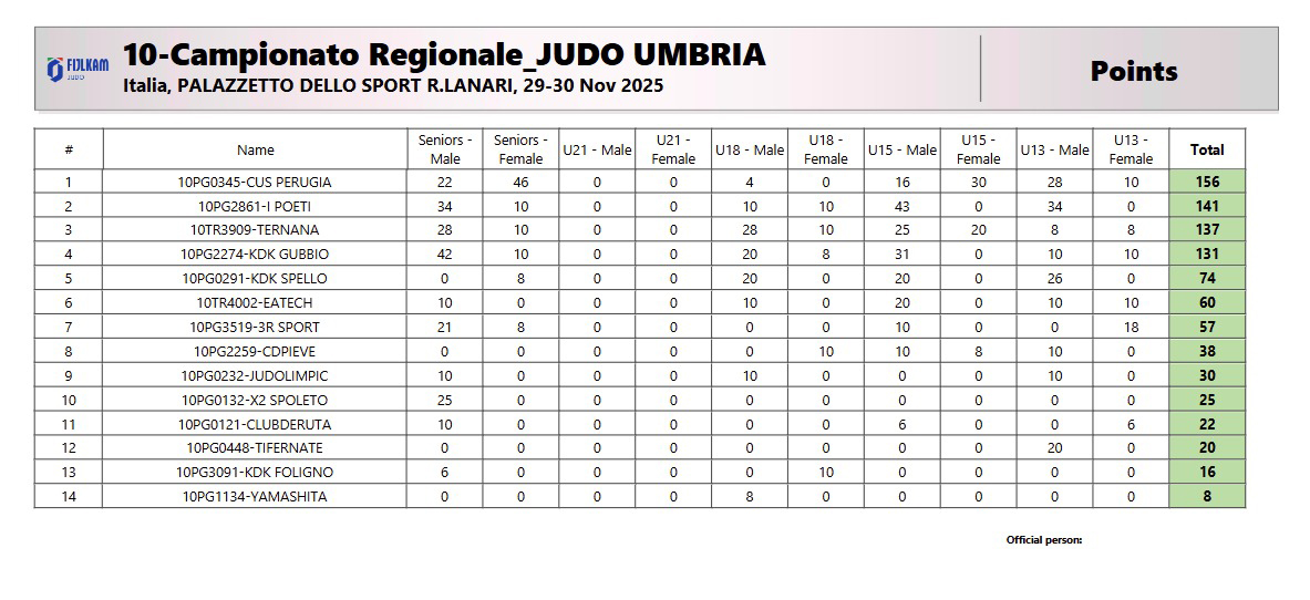 MASSA MARTANA - E' stata una mattinata impegnata per tutti i judoka della nostra regione, ben 110 gli iscritti, che a Massa Martana si sono sfidati alla conquista del Titolo di Campione Regionale. Un campionato che è tornato a far battere i cuori dei ragazzi, in particolare dei più giovani, Esordienti A ed Esordienti B, che nella prima mattina di domenica 30 hanno avuto modo di confrontarsi con i pari età della regione, mettendo in mostra anche un judo di ottimo livello, non a caso erano presenti anche atleti di A1, prossimi al Campionato Italiano del 14 dicembre. Spazio poi ai Cadetti, e a Juniores e Seniors, che hanno avuto anche modo di accumulare preziosi punti per la corsa ai Dan agonistici. Ottima presenza anche delle cinture colorate che hanno avuto modo di fare esperienza con i pari grado, senza competere con le cinture più scure, in qualsiasi classe di età. Il successo finale è andato nelle mani del Cus Perugia, che ha portato a casa il titolo con ben 156 punti raccolti in tutte le categorie. Seconda piazza per i Poeti del Judo che di punti ne hanno raccolti ben 141, terza posizione per la Polisportiva Ternana, che chiude la gara con 137 punti. Ai piedi del podio il Kodokan Gubbio, con 131 punti e il Kodokan Spello con 74.